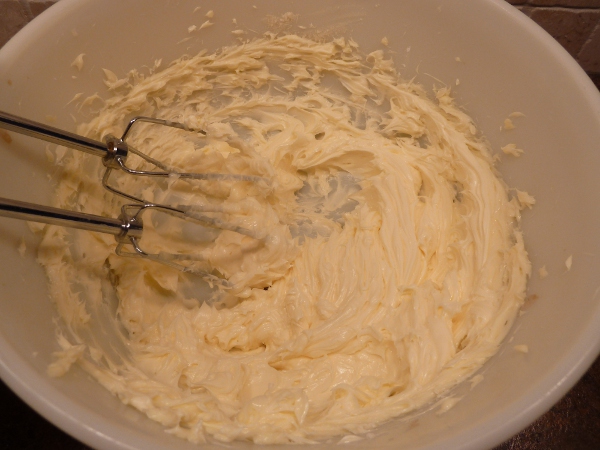 Gradually add the flour and sugar mixture. Beat with an electric mixer until it is light and fluffy(about 7 or 8 minutes). It will have the texture of stiffly whipped cream. This picture shows the mixture when it is first blended and then after it has been whipped for 8 minutes.