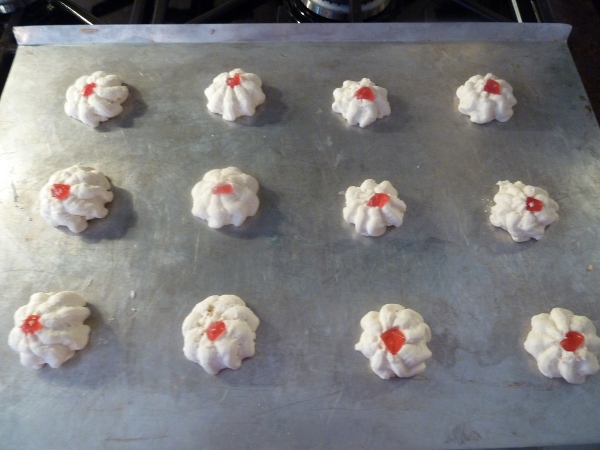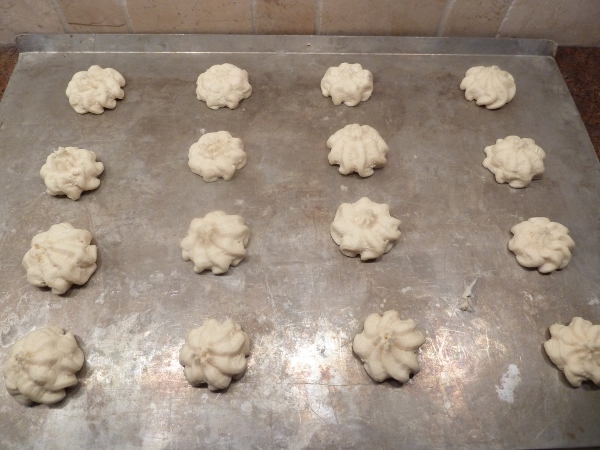 Pipe with a piping bag with a 1 inch diameter serrated opening or you can use a cookie press or you can drop from a teaspoon onto an ungreased cookie sheet.